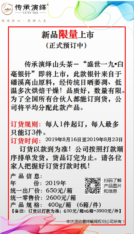 传承演绎白茶隶属于福建省传绎茶业股份有限公司旗下品牌,传承演绎“专注”福鼎白茶核心产区“山头茶”研制、栽培、生产、加工、销售及白茶文化传播,用心打造“山头茶”匠心品牌引领者;传承演绎制定“山头茶”的战略定位,并提炼出了“传承匠心,演绎人生”的品牌精神。“传承传统工艺,演绎白茶之美”的品