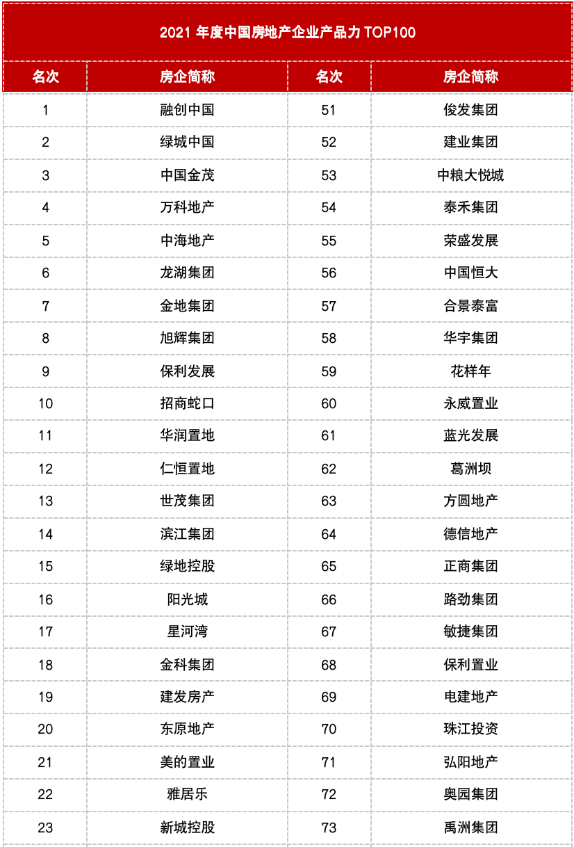 《中国房地产企业产品力百强》主要以企业在产品维度的整体表现为核心,共分为四个一级指标,从“产品接受度”、“产品系成熟度”、“产品美誉度”、“获奖与认证”四个维度对企业产品力进行评价,综合衡量房企在产品研发、整合、建造、质量、口碑等多方面的综合产品竞争力。最终得出以下结果: