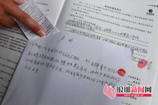 担保公司在空白合同上补填霸王条款,并让车主写下自愿接受处理的证明。