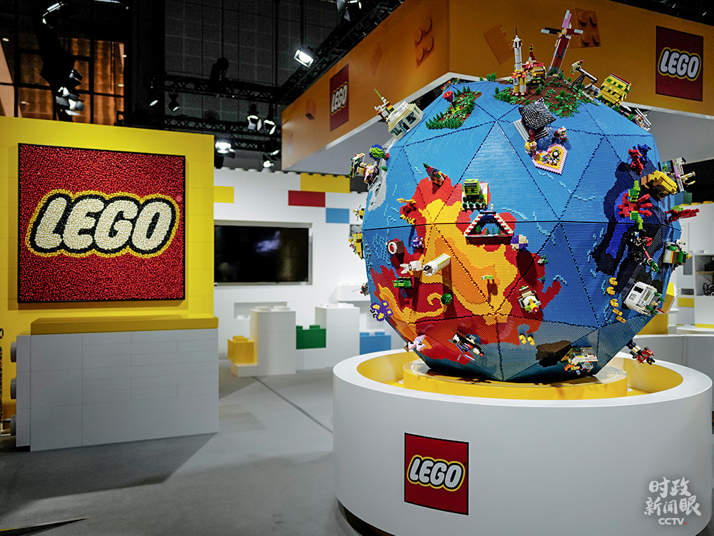 △这是进博会消费品展区的“乐造星球”展品,高2.7米(含底座),共包含62750块乐高积木颗粒,颗粒总重量达106千克。(总台国广记者李晋拍摄)