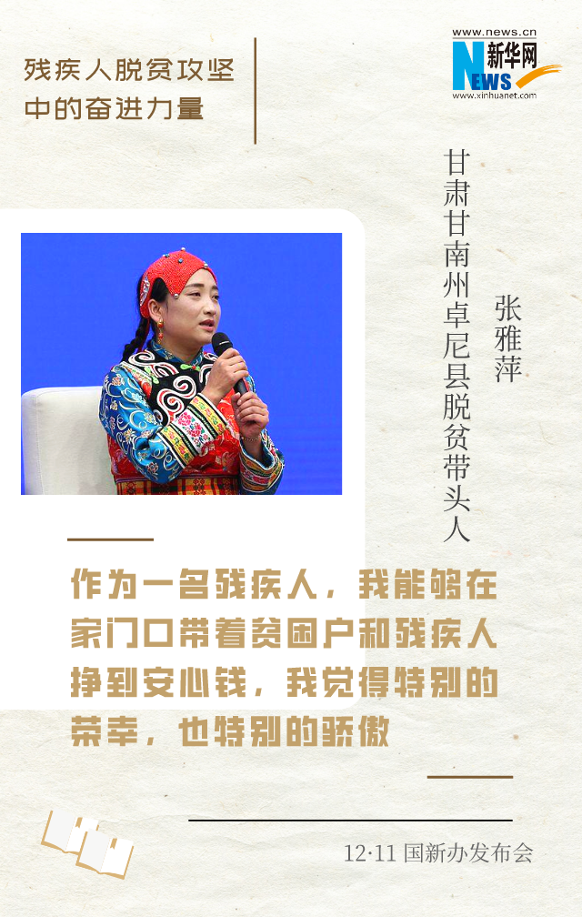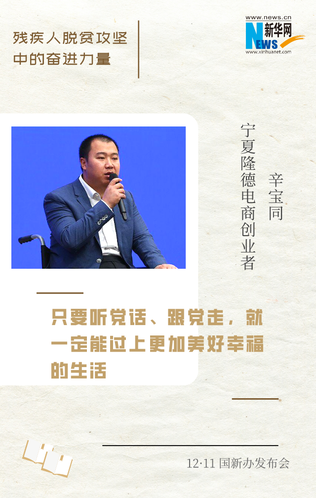 新华网北京12月11日电(王莹)在脱贫攻坚的战场上,涌现出许多残疾人自强脱贫的先进典型和脱贫攻坚一线奋力拼搏的工作者。12月11日上午,国新办邀请到他们中的4位代表,围绕“残疾人脱贫攻坚中的奋进力量”与中外记者见面交流。一起来听他们的脱贫故事和脱贫经验。