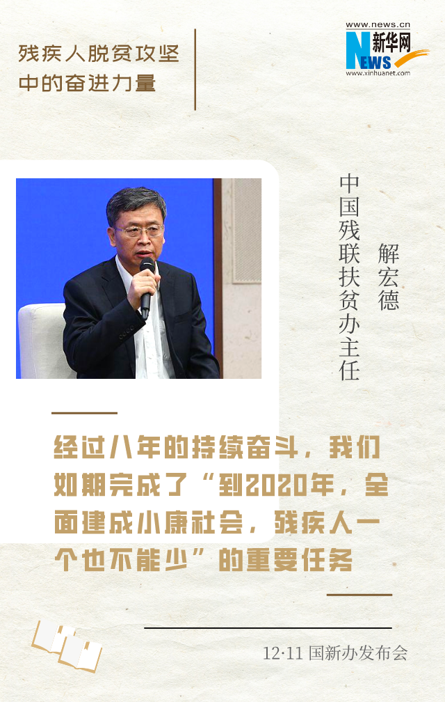 解宏德是中国残联扶贫办主任。五年来,全程参与了残疾人脱贫攻坚工作。他介绍,在残疾人脱贫攻坚这条战线上,各级残联组织将残疾人脱贫攻坚作为最重要、最紧迫、最艰巨的一项政治任务来抓。经过八年的持续奋斗,我国将如期完成“到2020年,全面建成小康社会,残疾人一个也不能少”的重要任务,现行标准下农村贫困残疾人将如期全部脱贫,消除残疾人绝对贫困。