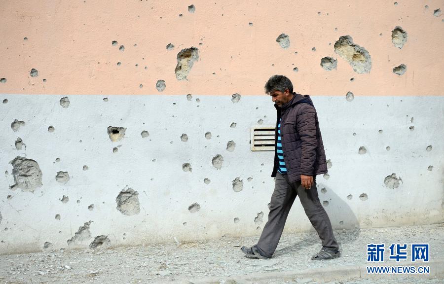 9月29日,在阿塞拜疆靠近纳卡地区的塔塔尔,一名村民从布满弹孔的墙壁旁经过。新华社发(巴巴耶夫摄)
