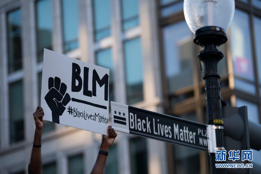 6月8日,一名男子在美国华盛顿白宫附近手举“黑人的命也是命”的标语,抗议警察暴力执法致非裔男子乔治·弗洛伊德丧生。新华社记者 刘杰 摄