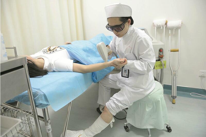 “最近天气热了,来科室就诊的患者增多,如果我休息了,同事忙不过来,患者就得等更久。”她解释说。为了不让打上石膏的部位见水,徐露在伤脚外面套了一个大塑料袋。做治疗时,她将左脚轻轻搁在地上,每位患者约半个小时的治疗下来,左脚疼得如针刺火烧。担心上厕所不方便,她上班期间几乎不喝水。