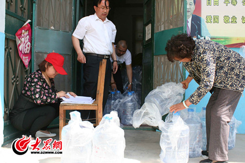 临沂天桥实业公司为义堂镇前耿埠社区的村民免费赠送水桶