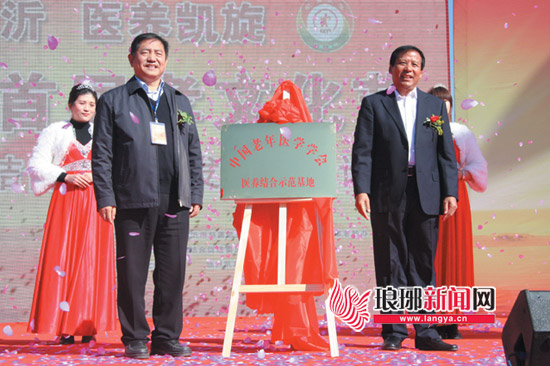 中国老年医学学会副会长陈运奇(左一)和临沂市人大常委会原党组副书记、副主任、市慈善总会会长徐福田(右一)为临沂凯旋“医养结合示范基地”揭牌