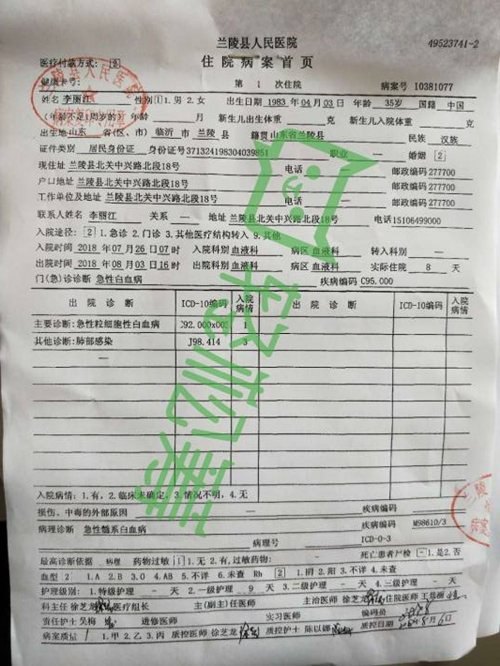 一家五口人,三个可爱的孩子,日子算是过的其乐融融,可天有不测风云,人有旦夕祸福,就在半个月前,突感身体不适,发烧,乏力,在诊所治疗无果,来到兰陵县人民医院经过检查结果犹如晴天霹雳,结果为急性粒细胞性白血病,也给一家人一个沉重的打击,妻子整日以泪洗面,却还要在他面前做的若无其事,他们一家人该如何走下去,孩子还小最小的才刚刚一周岁,孩子不能没有爸爸,妻子不能没有丈夫,父母不能失去儿子,这个家更不能没有你。