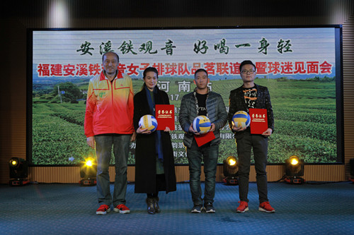 今天刚好是感恩节,借这个美好的节日,我谨代表福建女排对安溪铁观音和安溪的球迷朋友们长期以来对我们的支持表示衷心的感谢和崇高的敬意。在你们的支持下,福建女排已更名为福建安溪铁观音女子排球队,真的是“安溪铁观音,好喝一身轻”;同时,也感谢安溪县委、县政府、河南的各界茶人代表和球迷朋友们!今天为我们举办的品茗联谊暨球迷见面会。女排队长的发言让在豫茶商、茶企兴奋不已,通过安溪铁观音的韵味芳香、女排拼搏沙场的勇往直前,共同宣传“安溪铁观音好喝一身轻”的品牌理念。神州韵茶业公司董事长詹方枝、总经理王飞耀、执行董事李宏华,为女排赠送茶礼,女排队员签名赠球给茶商代表,把整个活动推向高潮。
