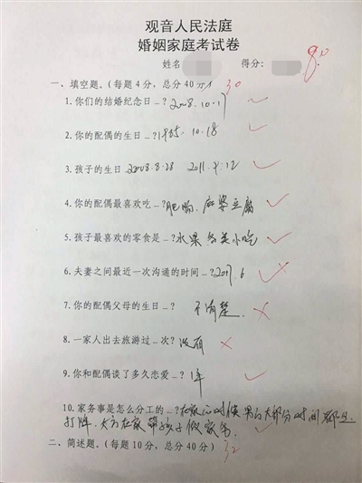 查看离婚试卷,记者发现,该考卷分为三部分,分别是填空题、简述题和陈述题。填空题共10道,每题4分,包括结婚纪念日、配偶的生日、孩子的生日,配偶父母的生日,夫妻之间最近一次沟通的时间、家务事怎么分工的等基本情况的问答。