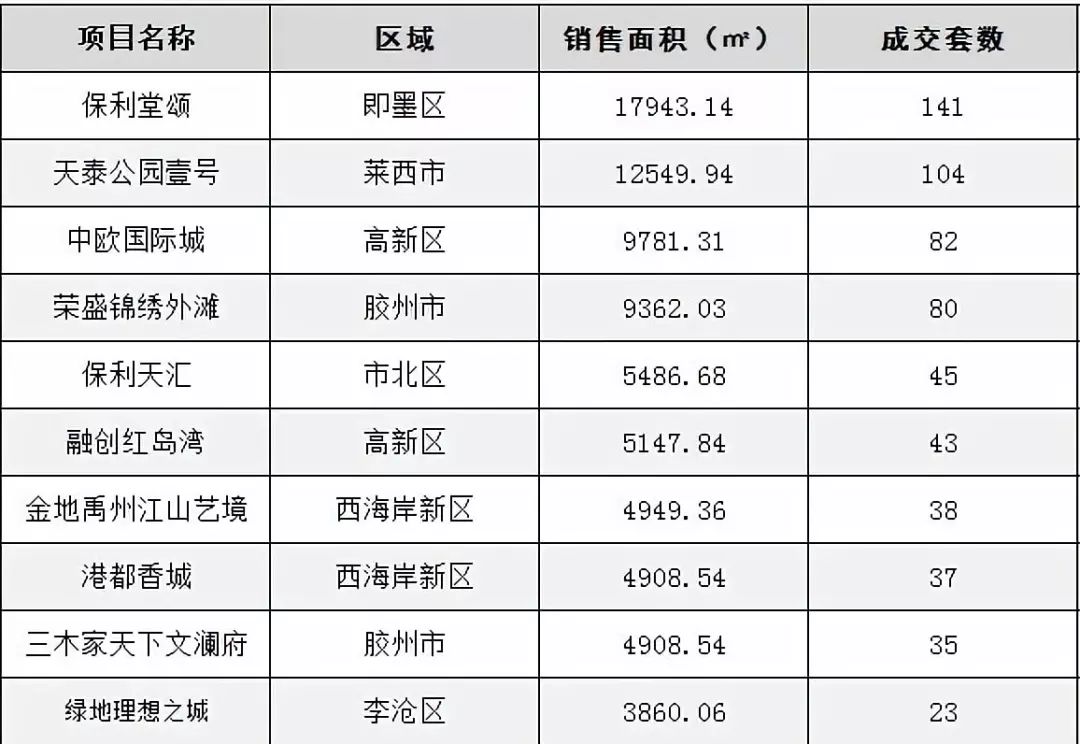 从成交排行榜Top10来看,楼盘分布较为分散,与此前出现的“一家独大”不同,几乎各区均有成交的“王牌”楼盘。即墨区的保利堂颂以17943.14㎡的销售面积、141套的成交套数夺得榜首。
