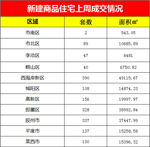 西海岸新区成交量328套,成交面积38992.84㎡。