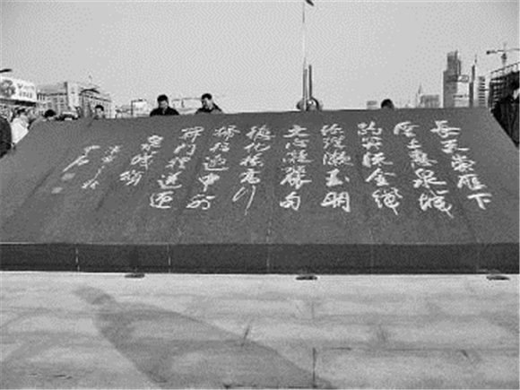 在济南,很多地方能看到欧阳中石题词,非常著名的要数《泉城颂》石刻,石刻正面为《泉城颂》全文,背面为释文。