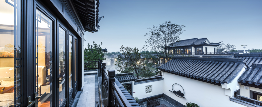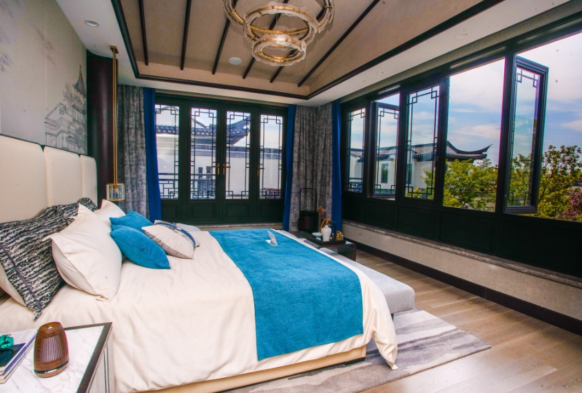 如果说一层是动静相宜,那么二层则更多一份私享的静谧。这里是家人专属的领地,所以有奢华的卧房与敞亮的露台,屋檐上的窗,更是四季分明的藏着百花、明月、凉风、冬雪,像洞明世事的眼睛 。二层的主卧,尺度格外开敞,连着大露台,凭栏可见白驹过隙,还有粉墙黛瓦与荷塘芭蕉。进有天地,退亦自成天地,世间的美好不过如此。