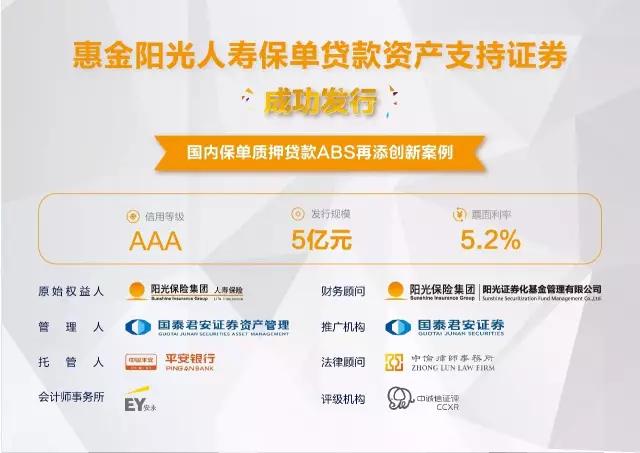 8月29日,由阳光人寿与惠金所全资子公司阳光证券化基金管理有限公司合作的“惠金阳光人寿保单贷款资产支持专项计划”成功发行,并将于近期在上海证券交易所挂牌。该项目的成功发行,标志着国内首个“无结构化”和“黑红池”保单贷款证券化项目正式落地。