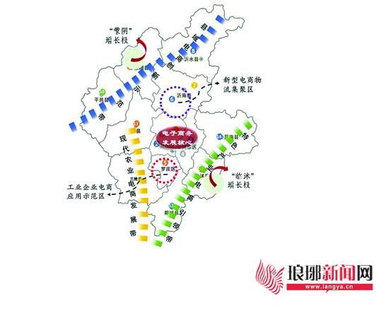 规划绘就了临沂市电子商务产业布局图,重点打造“一心两区,两极三带”的发展格局。一心,即以兰山区、河东区、经开区为载体的电子商务发展核心;两区,即商贸、工业企业电商应用示范区与新型电商物流集聚区;两极,即蒙阴县、临沭县两大电商增长极;三带,即县域电商创新示范带、现代农业电商发展带、特色产业电商引领带。