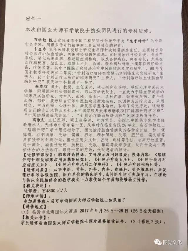 为落实国家《中医药十三五发展规划》,山东圆觉文化传播有限公司联合北京济世康民医学研究院特此举办《国医大师石学敏院士针灸医学进修班》,宗旨是来弘扬国医思想,传承针灸技法,提高中医从业者的针灸技能。
