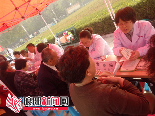 10月28日上午,恰逢重阳时节,由临沂市卫生和计划委员会和临沂综合频道联合举办的“相约重阳 共话健康 《名医面对面》栏目一周年专家见面会暨大型义诊活动”在临沂市人民广场成功举办。此次活动,医资力量雄厚,参加义诊的有来自临沂市人民医院、临沂市中医院、临沂市妇幼保健院、临沂皮肤病医院、临沂市血站、临沂市疾控中心、山东医专附属医院等多家医院的内科、外科、儿科、骨科、中医科等众多知名专家,携听诊器,血压计等常用医疗器械,热情为患者诊治、解答咨询、发送健康教育资料,免费义诊。