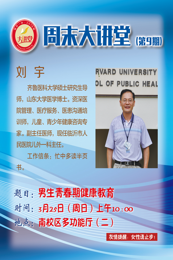 3月25日上午,我校南校区第9期周末大讲堂在多媒体教室举行。本次活动邀请了临沂市人民医院儿外一科刘宇主任,刘主任以《男生青春期健康教育》为题为高一和高二的男生作了精彩的报告。