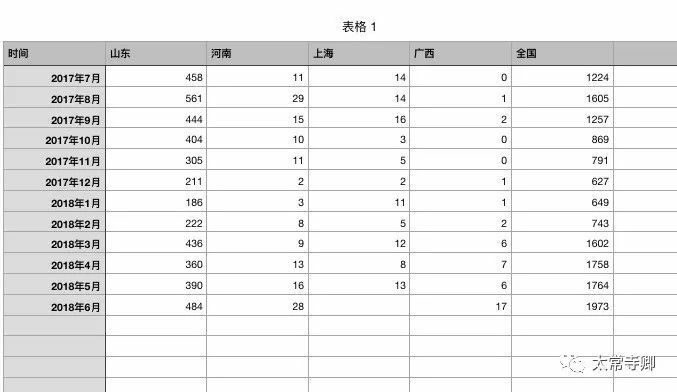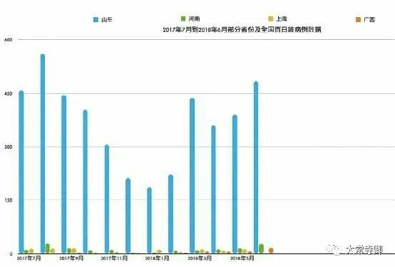 我们查询了山东、上海、广西、河南4省市区卫计委官网公开的每月疫情法定传染病疫情;以下图标清晰地展示了4省百日咳发病数量的对比,不难看出,山东所占据的数量相当之大。在时间段中,我们选取了2017年7月份至2018年6月份12个月的数据(其中,上海市6月份数据尚未公布)。数据显示,山东省在过去一年中百日咳的发病数量与其他省份相比,呈现出十几倍甚至几十倍的差距。
