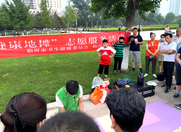 在临沂市人民广场,来自临沂市人民医院的医务人员为市民开展心肺复苏、中医刮痧以及健康咨询服务,普及户外活动急救必备技能,提供专业的妇产儿科、老年人的健康管理知识咨询。通过现场演示、发放宣传单、集中宣讲等方式向群众宣传急救知识和疾病预防知识知识。