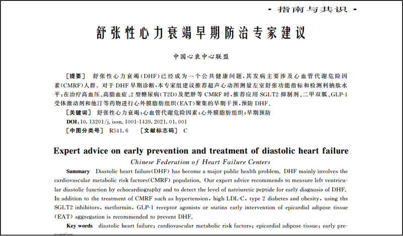 2020年12月25日,由中国心衰中心联盟制定的《舒张性心力衰竭早期防治专家建议(2021)》(以下简称《专家建议》)在《临床心血管病杂志》上正式在线发布。《专家建议》指出,舒张性心力衰竭(DHF)目前已经成为全社会的一个公共健康问题,其发病主要涉及心血管代谢危险因素(CMRF)人群;强调加强对舒张性心力衰竭患者的早期诊断,早期干预;并推荐具有改善心室舒张功能的芪苈强心胶囊用于舒张性心力衰竭的早期防治。芪苈强心胶囊成为此次《专家建议》唯一推荐中成药。