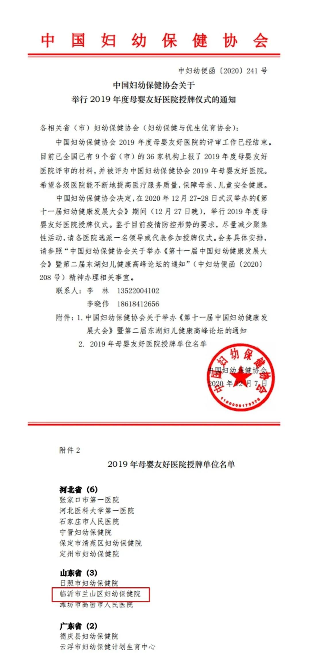 12月27日,中国妇幼保健协会在武汉举办了第十一届妇幼健康发展大会,会议期间举行了2019年度母婴友好医院授牌仪式,兰山区妇幼保健院被评为中国妇幼保健协会2019年度母婴友好医院,院党委副书记姜丽涛参加授牌仪式。 “母婴友好医院”项目由中国妇幼保健协会牵头并在全国推广,旨在引导各级各类助产服务机构更加重视妇幼健康服务,减少非医疗指征剖宫产,促进自然分娩,降低剖宫产率,提高母乳喂养率,促进母婴健康。 今年6月16日,山东省妇幼保健协会专家组对兰山区妇幼保健院创建“母婴友好医院”工作进行了评审验收。7月10日,山东省妇幼保健协会下发评审通报,通过了评审。 兰山区妇幼保健院高度重视“母婴友好医院”创建工作,成立了由院长主抓医院“母婴友好医院”领导小组与技术指导小组,严格落实评审标准各项要求,积极开展各类培训,综合推进母婴友好医院创建工作。 下一步,兰山区妇幼保健院将严格按照“母婴友好医院”标准,坚持妇幼保健与临床相结合的发展方向,进一步推动自然分娩,减少医疗干预,支持母乳喂养和加强新生儿保健,进一步深化“母婴友好医院”工作内涵,为全区广大妇女儿童的健康事业做出更大的贡献。 ◆编辑/闫宗敬 周广聪