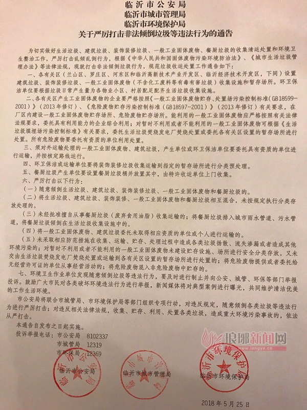 5月25日下午,记者从临沂市《关于严厉打击非法倾倒垃圾等违法行为的通告 》新闻发布会上获悉,我市将严厉打击非法倾倒垃圾等违法行为,切实做好生活垃圾、建筑垃圾、装饰装修垃圾、一般工业固体废物、餐厨垃圾的收集清运处置和环境卫生整治工作,严厉打击乱倾乱倒行为。