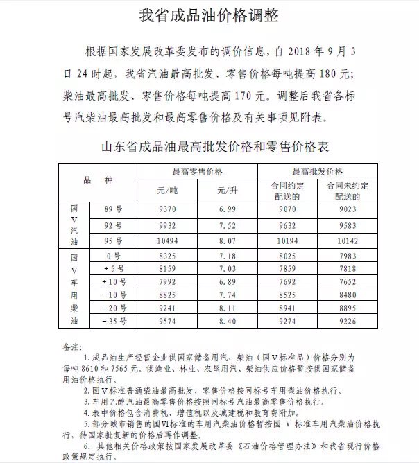 根据国家发展改革委发布的调价信息,自2018年9月3日24点起,山东省汽油最高批发价、零售价格每吨提高180元;柴油最高批发、零售价格每吨提高170元。调整后山东省各标号汽柴油最高批发和最高零售价格及有关事项见附表。
