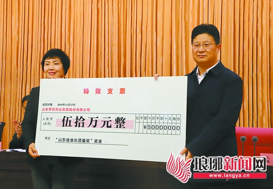 孟庆斌为获得省长质量奖的罗欣药业集团颁奖