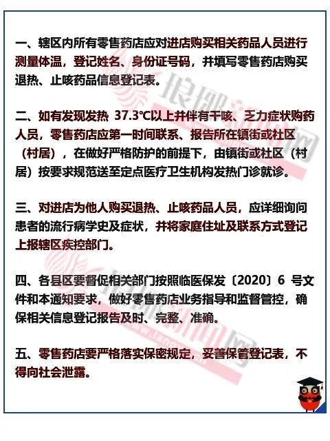 3月6日,市委新冠肺炎疫情处置工作领导小组(指挥部)办公室发布《关于进一步规范疫情防控期间到零售药店购买退热、止咳药品人员信息登记报告制度的通知》,对到全市零售药店购买退热、止咳药品人员实行信息登记报告制度。