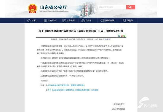 公告中写道,为规范山东省电动自行车管理,保护公民人身和财产安全,省公安厅经调研论证起草了《山东省电动自行车管理办法(草案征求意见稿)》。为推进开门立法、民主立法,增强立法的科学性和可操作性,提高立法质量,面向社会公开征求意见建议。