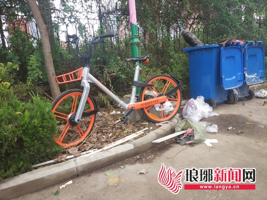 在兴隆路与陶然路交会处的旭阳阳光花园小区,沂蒙晚报记者也发现了三辆摩拜单车,其中一辆摩拜单车停放在了小区垃圾桶旁,另一辆摩拜单车不知为何没有了车筐。