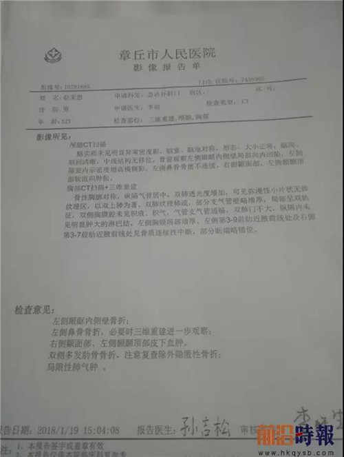 医生告诉记者,赵家恩属于重伤,断了12根肋骨。济南市章丘区人民医院的检查报告上显示,赵家恩左侧眼眶内测壁骨折,左侧鼻骨骨折,右侧颧面部、左侧额颞顶部皮下血肿,双侧多发肋骨骨折,局部性肺气肿。