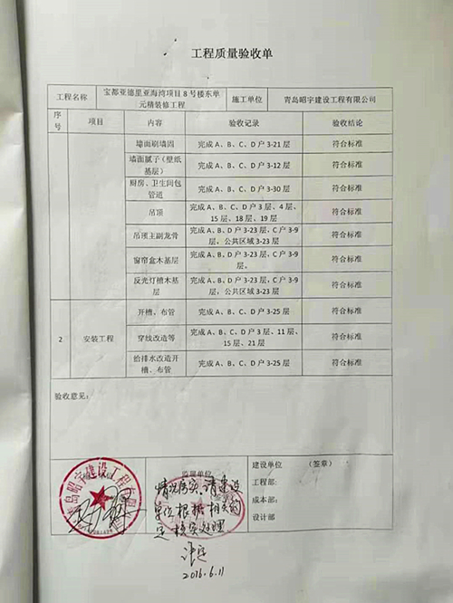 “下面我再介绍一下8号楼装修工程款被拖欠的情况。”赵永场手指《工程质量验收单》对记者说:“2016年 4月28 日,我们开始了8号楼的装修施工。根据我们双方签订的《施工合同》,宝都公司应按照每个月的施工进度付款。第一次付款时间是2016年6月10日。我们在合同期内完成了工程,并通过了监理单位的验收。”