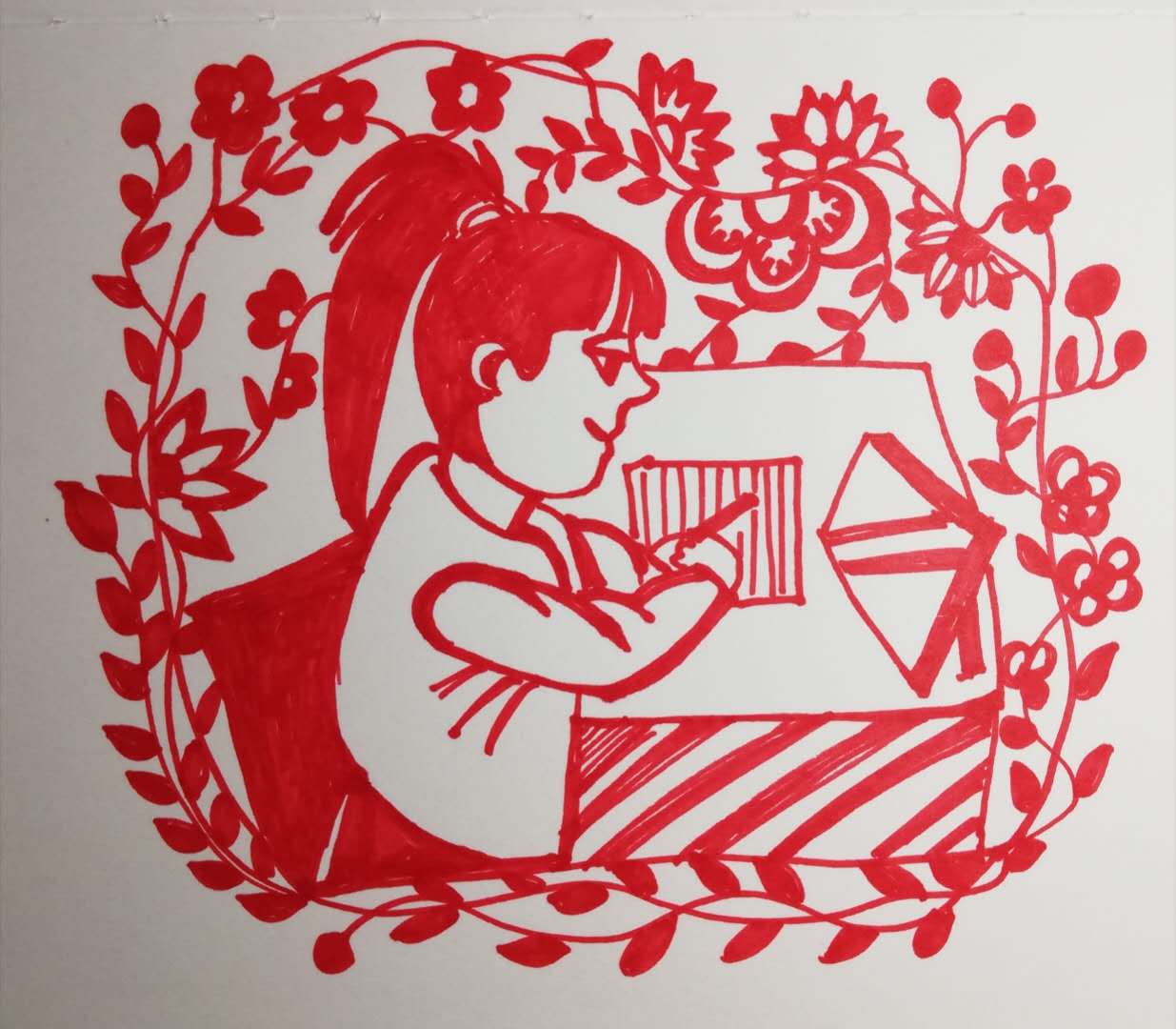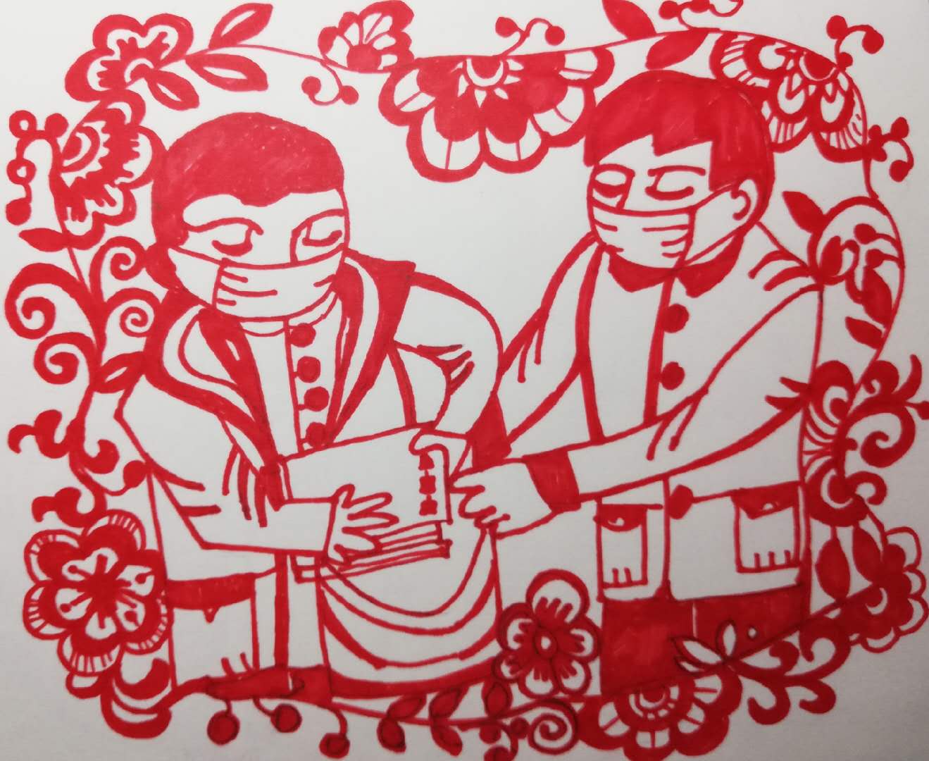 这一幕幕令人感动的场面,牛鑫老师情不自已,发挥自己的艺术所长,利用手中的剪刀和红纸剪纸创作,剪出了一幅幅分书、送书、收书的作品,把感人的场景用这种古老的民间艺术记录身边的“战疫人”,以此温暖他们,用艺术的力量致敬,助力疫情防控,用这些作品表达美好祝愿。(赵玉娟)