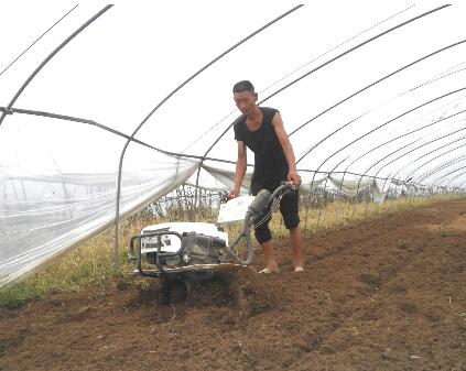 7月18日,郯城县马头镇黄金殿家庭农场的大棚内,新型职业农民、农场场主王连平正在运用微耕机翻耙土地。