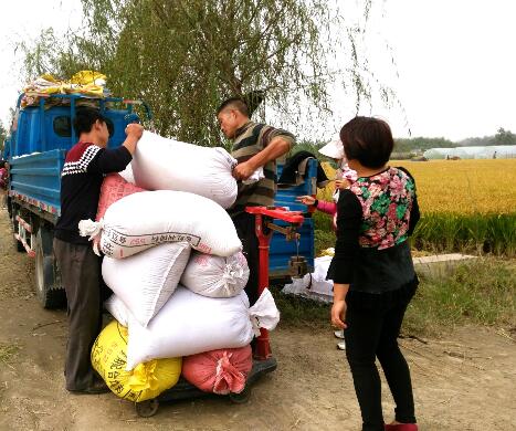 临沂民生网讯:稻谷飘香,商家跟上。10月7日,在郯城县马头镇采莲湖片这两对来自街道颜屯村的夫妻俩忙碌着过称装车。采莲湖片稻谷香飘四溢,吸引“鸳鸯车队”的20多辆三轮车前来购销,当天价格为1.13元成交。
