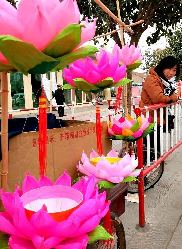 临沂民生网3月2日讯:元宵节前夕,在郯城县马头镇街头路旁,一位卖“宝莲灯”的女摊主焦急的等待买主。
