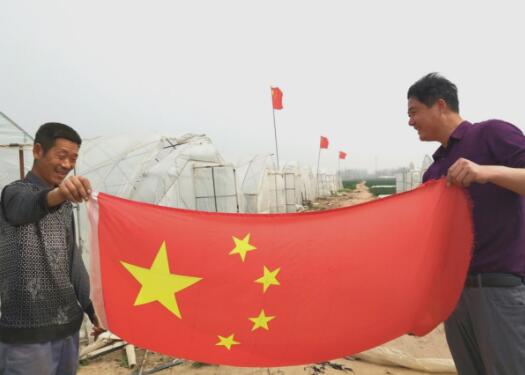 临沂民生网讯:4月9日,在郯城县马头镇黄金殿蔬菜瓜果种植基地的家庭农场、浩源家庭农场等湖片,随处可见五星红旗迎风飘扬。郯城县马头镇许多农业种植家庭农场,在党惠农政策的扶持下,和谐社会的帮助下,家家户户走上了富裕之路,全靠党的领导。蔬菜瓜果种植“能手”王连平(左)高兴地说:有这么好的国家和政策护着老百姓,日子过得越来越红火,俺为表达心情就将五星红旗插在了地头,要不忘党恩。(高军 摄影)