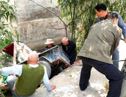 当天,郯城县花园乡周庄村的周作良老人到张髙册收破烂,不注意车子钻入路旁的深水沟,自己孤身一人没有了办法。张高册村村支部书记张志文得知情况,迅速组织人员伸出援助双手,他们用肩抗、绳拽,终于帮助老人将三轮车抬上安全地带。他们的做法,不仅为外乡老人周作良解决了应急困难,而且给村民做出来助人为乐的典范,受到过路行人的高度评价。(高军  摄影)