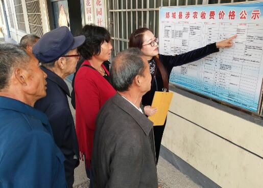 临沂民生网讯:5月7日,郯城县马头镇监督委员会的工作人员,在花园社区正在认真向群众详细介绍郯城县涉农收费价格公开》公示牌的具体内容。