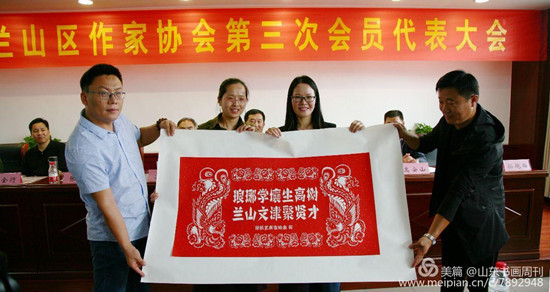 会议上,兰山区书法家协会、美术家协会、剪纸协会分别向区作协赠送了书画和剪纸作品,并表示了祝贺。