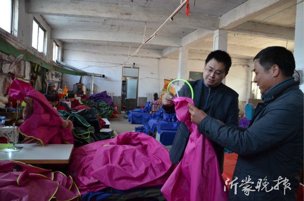 第一书记工作组孙浩然与村党支部书记刘庆臣在雨衣加工车间查看样品。