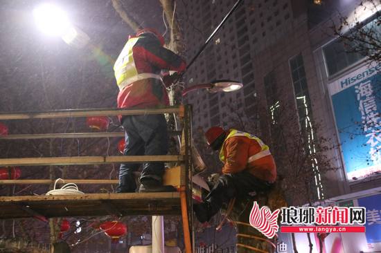 7日下午,解放路与沂蒙路交会处,临沂市城市照明管理处的施工人员正头戴安全帽、身披反光背心在路边忙碌,红灯笼在树枝挂起,闪光灯带在树干缠绕,解放路迎来最美夜晚。