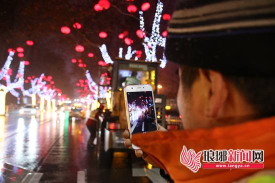 看到灯笼亮起,施工人员纷纷拿出手机拍照留念。