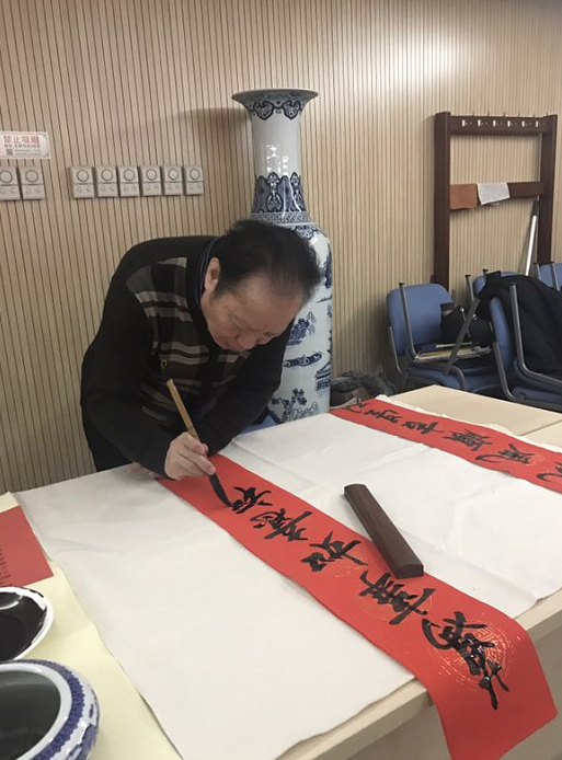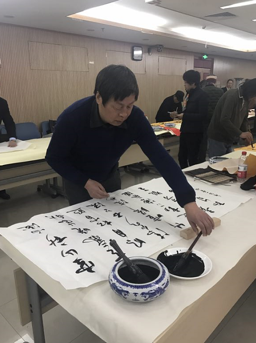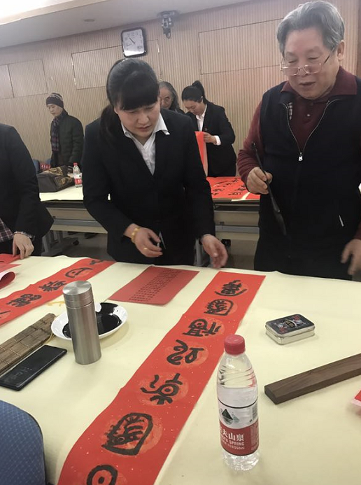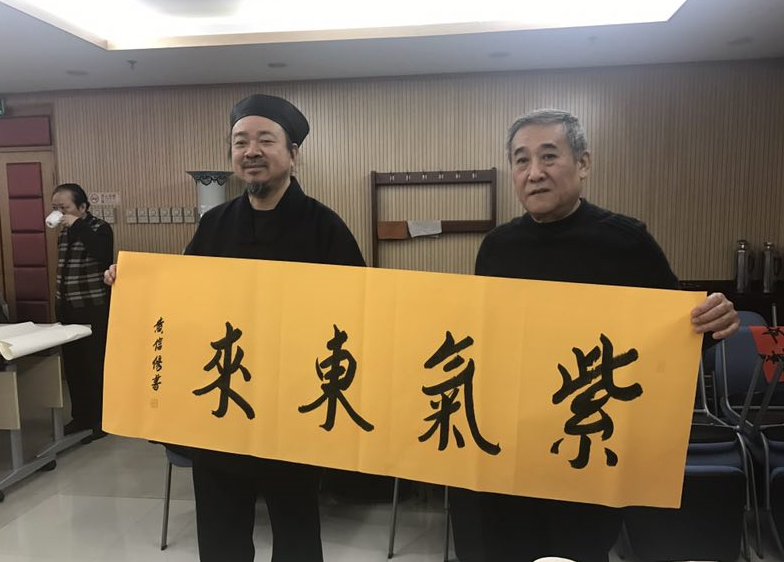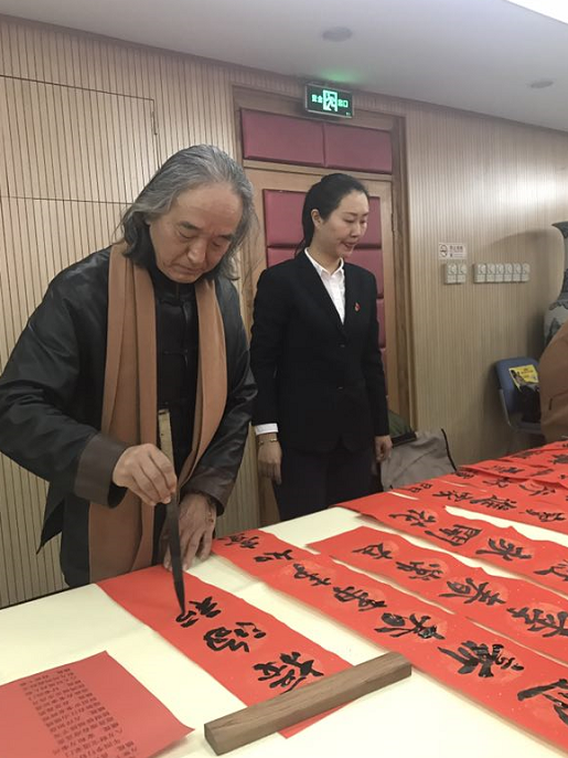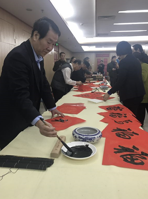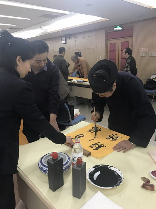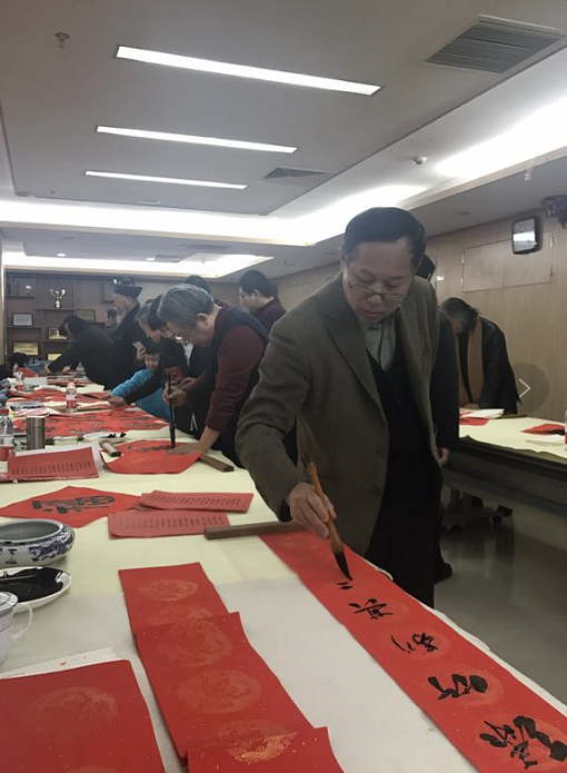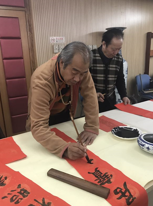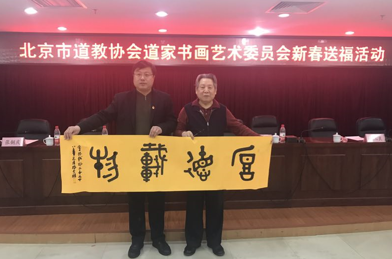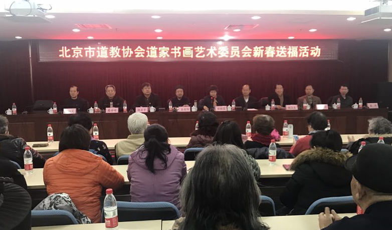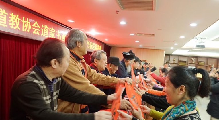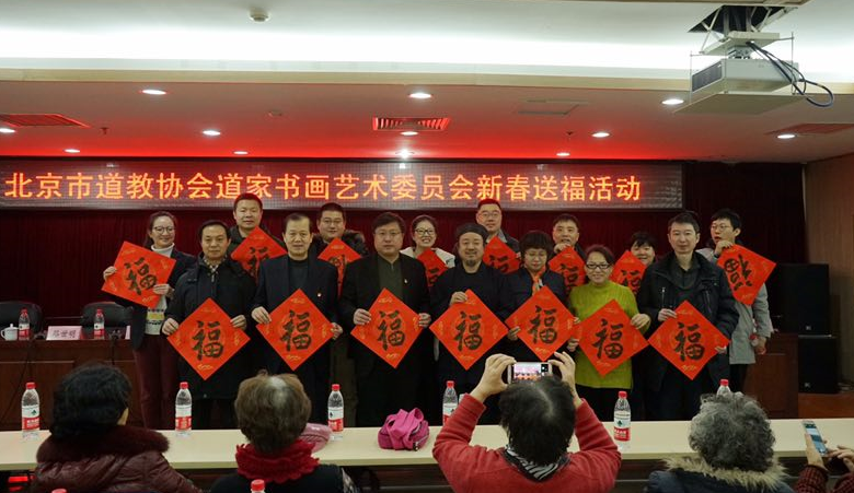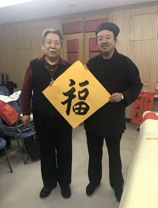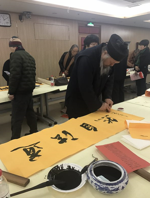 2018年2月4日上午,北京市道教协会和海淀区民宗侨办合作组织北京市道教协会道家书画艺术委员会书画家们来到海淀区曙光街道曙光办公中心,为社区居民写春联送福字。