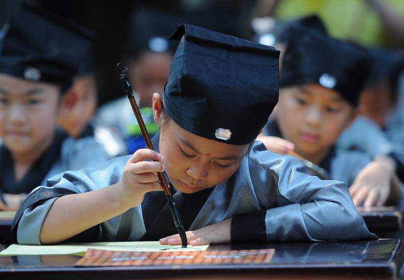 2018年8月1日,山东省济宁市孟府举办“开笔礼”活动,吸引千余小学生参加。活动现场。图片作者:徐飞/视觉中国