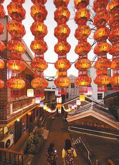 2月5日,海南琼海市嘉积镇溪仔古街的花灯扮靓老街。 |
