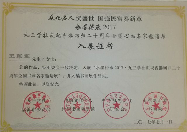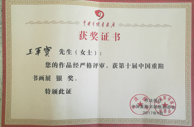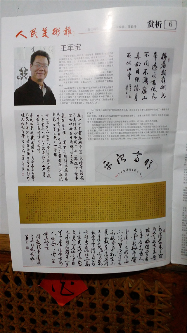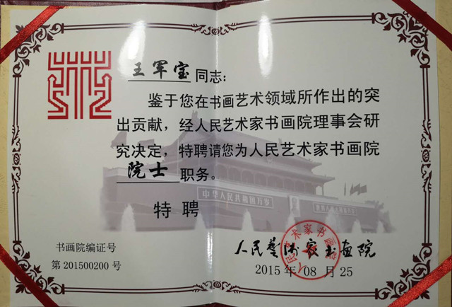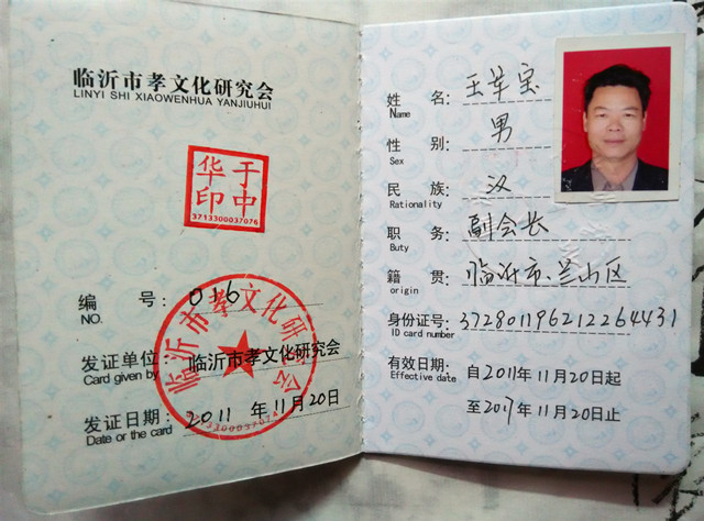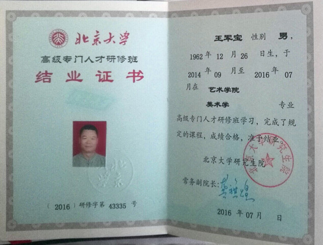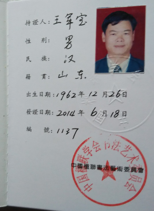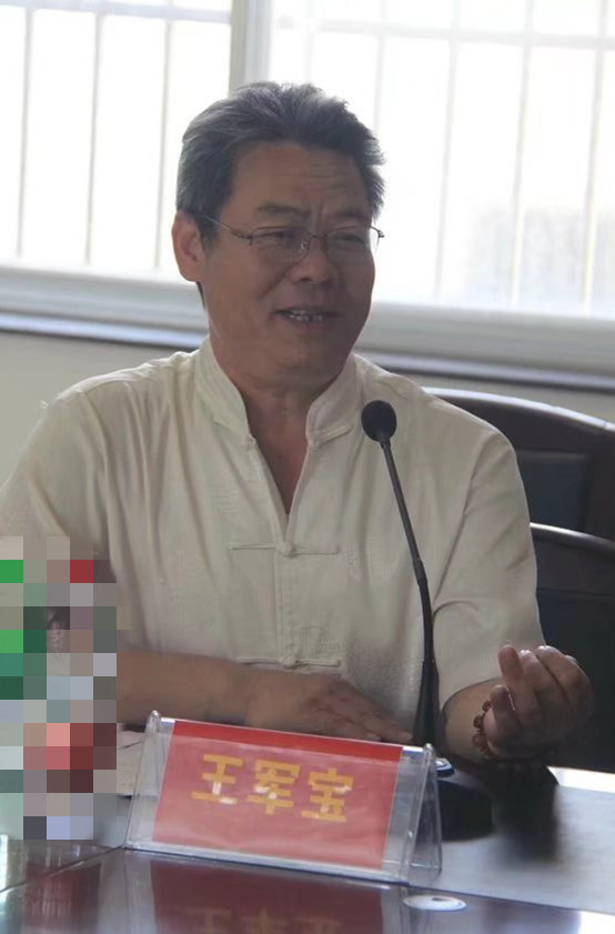 王军宝字惠生,临沂人。早年师范毕业,舌耕卅八载,爱读中国书,爱写中国字,爱着中国装,爱吃中国饭。以儒学为基亦傍窥佛道,为人子仅能不使父母蒙羞而已矣,若显亲扬名远未能也;至为努力,未能使父母尊显;教育子女成人而已,未能为国之良才,深以为恨。系以卧冰求鲤之圣王祥和舍命护兄之友王览为第一世的琅邪王氏第五十二世孙。
